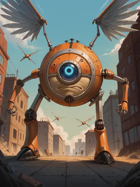 Monodrone: "modroneロボットで、体全体が円形で、1つの目を持ち、2本の脚、2本の腕、2枚の翼が生えている。脚は円形の体から直接生えている。"