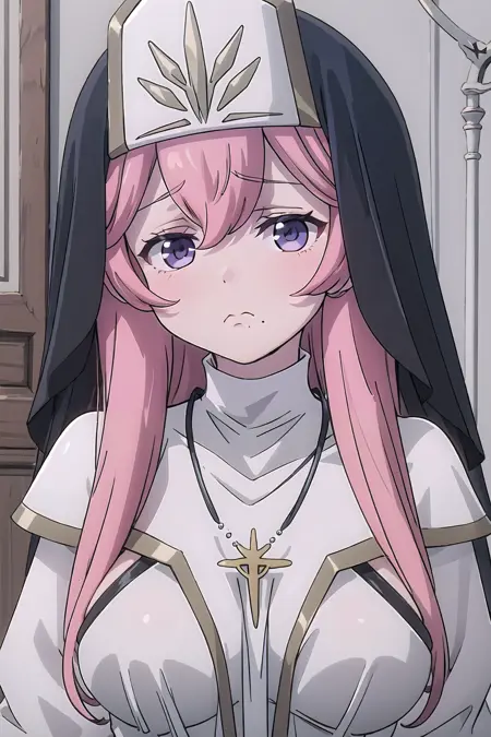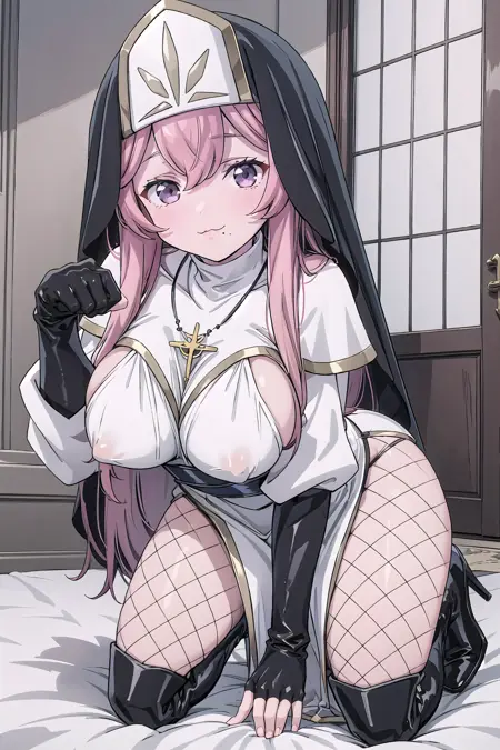 Dress: white_long_dress, Lilynette_Piani, sideboob, nun, habit, dress_with_black_edging, black_veil, cross_necklace, capelet_with_pelvic_curtain, white_capelet, capelet_with_gold_edging, long_sleeves, black_fingerless_gloves, black_belt, v_belt, side_slit, black_fishnet_legwear, white_black_footwear, high_heels, knee_boots