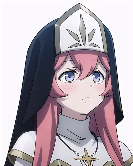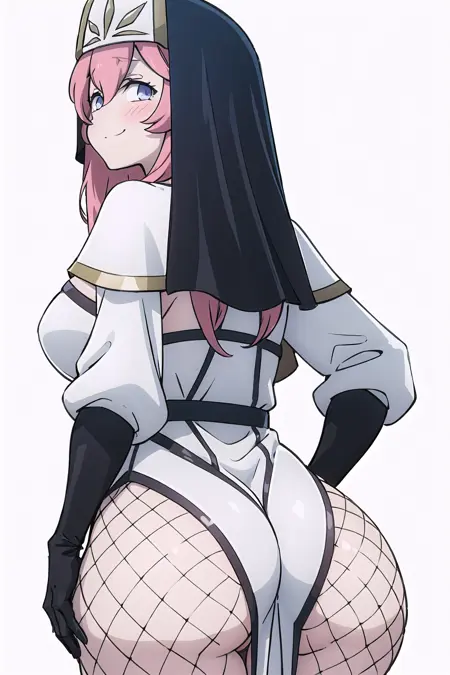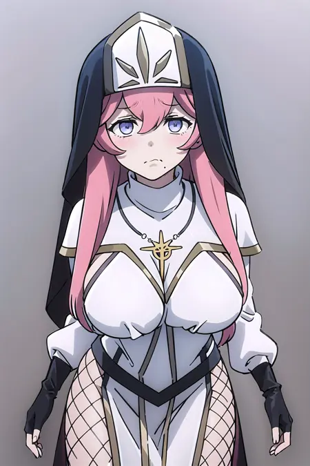 Dress: white_long_dress, Lilynette_Piani, sideboob, nun, habit, dress_with_black_edging, black_veil, cross_necklace, capelet_with_pelvic_curtain, white_capelet, capelet_with_gold_edging, long_sleeves, black_fingerless_gloves, black_belt, v_belt, side_slit, black_fishnet_legwear, white_black_footwear, high_heels, knee_boots