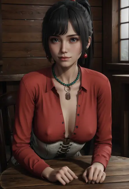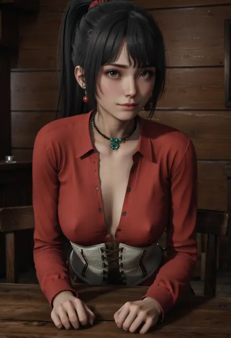 복장 1: 빨간 셔츠:긴 소매:부분적으로 풀린 버튼, 코르셋:가죽, 초커:비즈 목걸이, 귀걸이, 갈색 바지:허벅지 컷아웃:크로스 레이스 컷아웃. 검은 머리:ponytail,