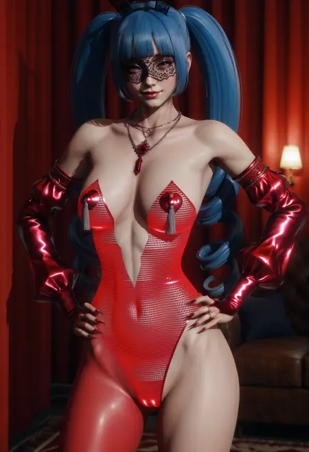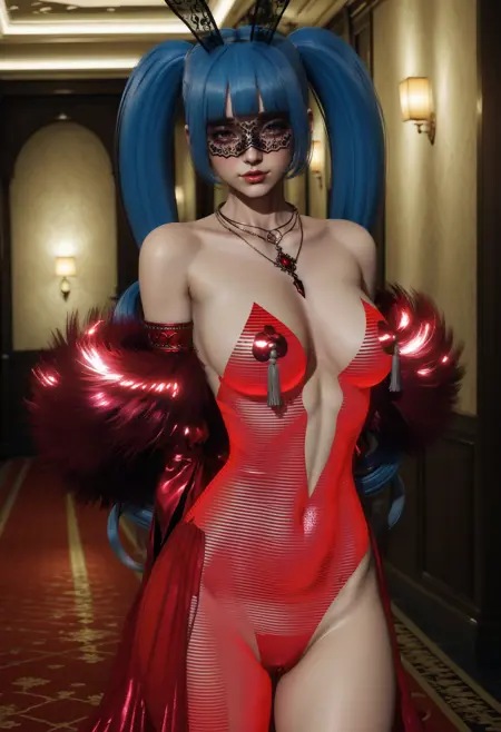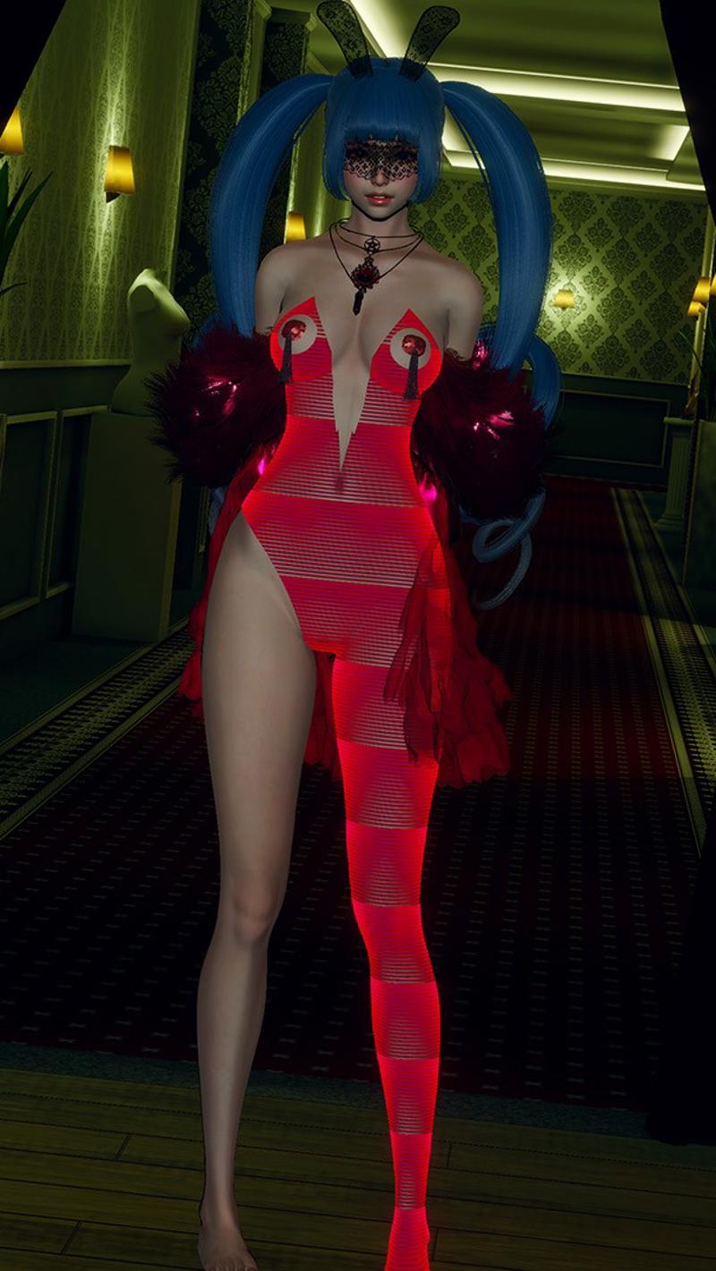 복장 2: 빨간 스트랩리스 레오타드:((한쪽 다리용 팬티스타킹)):빨간 다리 착용:투명:발광, 패스티:달팽이. 분리된 소매:빨간 신부 장갑:긴 손톱:빨간 손톱. 빨간 쇼걸 스커트. 깃털 스카프. 목걸이. 검은 토끼 귀, 마스크. 파란 머리:twin drills,