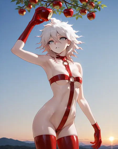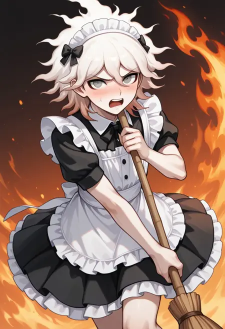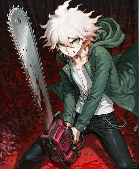 Main trigger words: nagito_komaeda, white hair, print shirt, black pants, green jacket, green eyes,