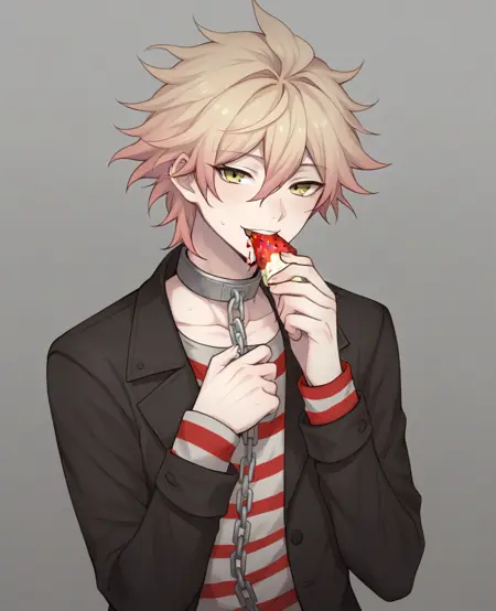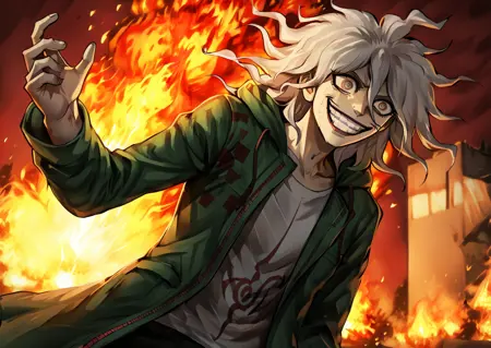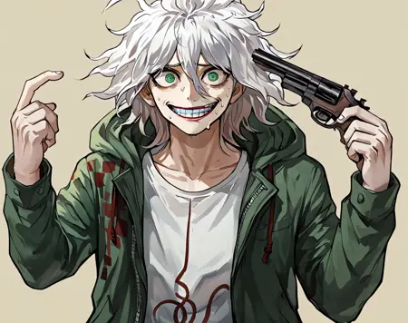 Main trigger words: nagito_komaeda, white hair, print shirt, black pants, green jacket, green eyes,