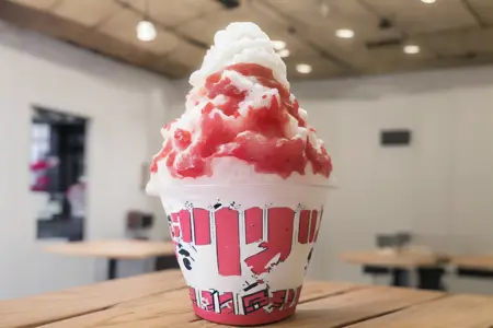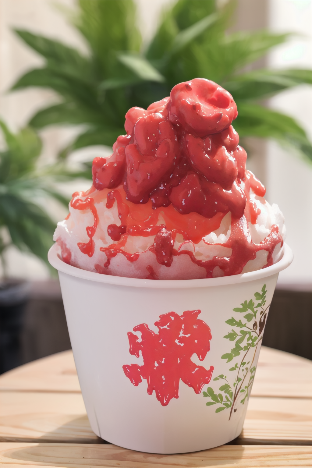 kakikoori, shaved ice, food, food focus, blurry, blurry background, depth of field, cup, still life