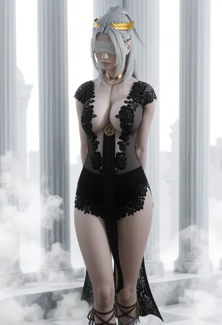 복장 1: 검은 셔츠, 레이스, 금색 목걸이, 금색 목걸이, 금사슬, 가슴 사이, 금팔찌, 십자형 끈 신발,