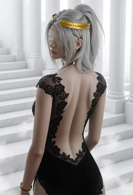 補助: 灰色の髪、半分編み上げたヘアスタイル、月桂樹の冠、目を包帯で覆っている,