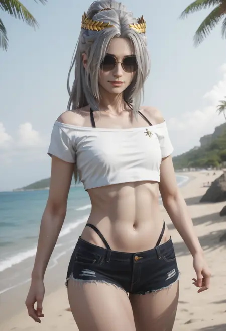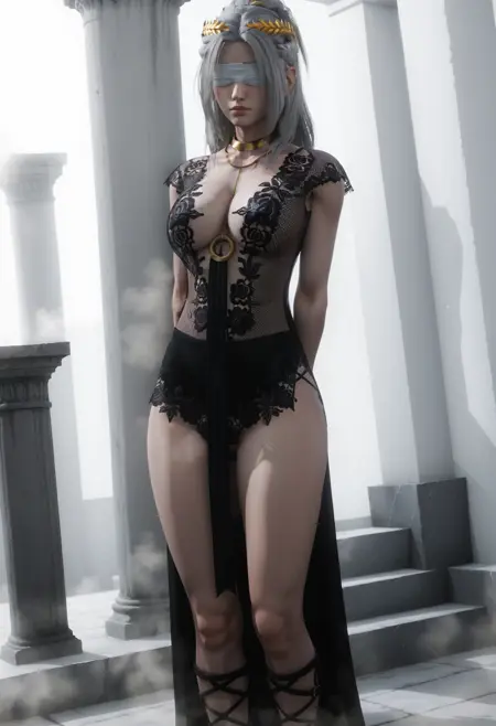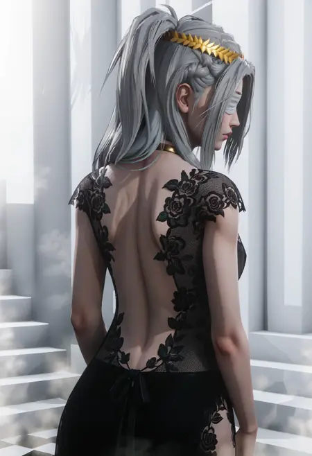 Secondary: grey hair, half up braid, laurel crown, bandages over eyes,
