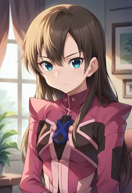 의상: 분홍 재킷, 분홍 하의, 검은 장갑,