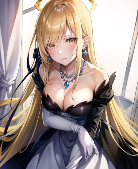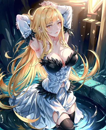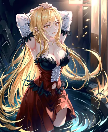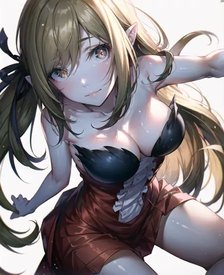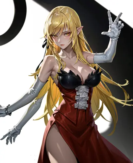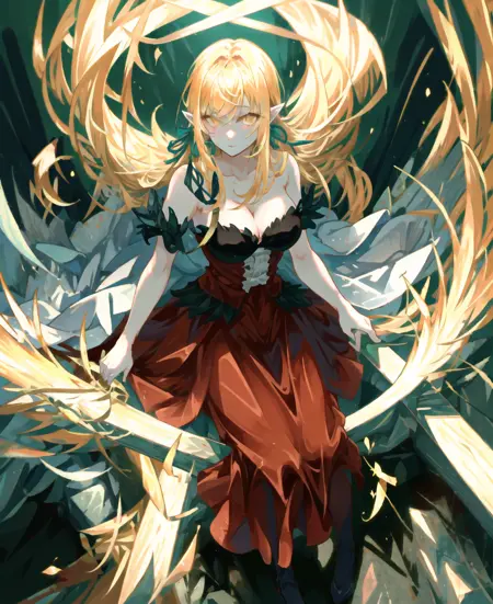 트리거 단어는 꼭 필요하지 않지만, 예를 들어 빨간 드레스, 금발 금발머리, 날카로운 날카로운 귀, 빨간 드레스, 검정 리본과 같은 태그를 사용하면 도움이 됩니다. (kiss-shot acerola-orion heart-under-blade)
