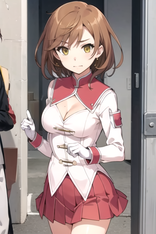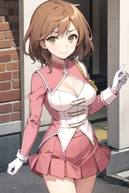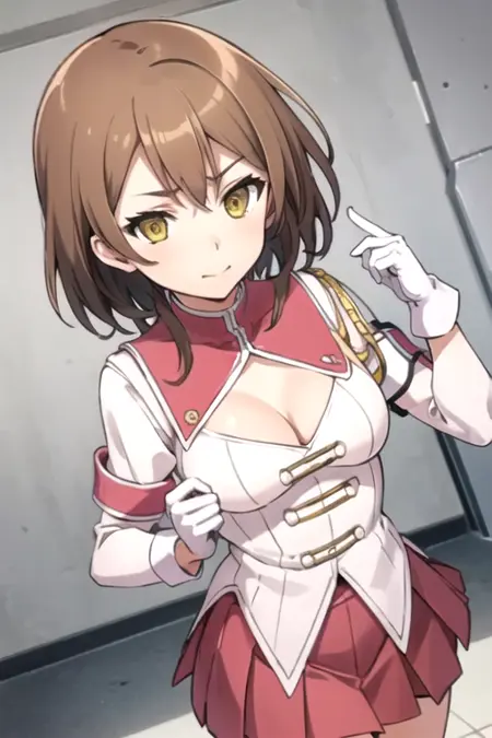 SakiIchinose, 1girl, solo, short hair, pleated skirt, brown hair, white gloves, cleavage, medium breasts, yellow eyes, miniskirt, cleavage cutout, red skirt, pink shirt