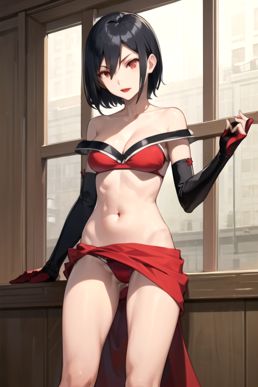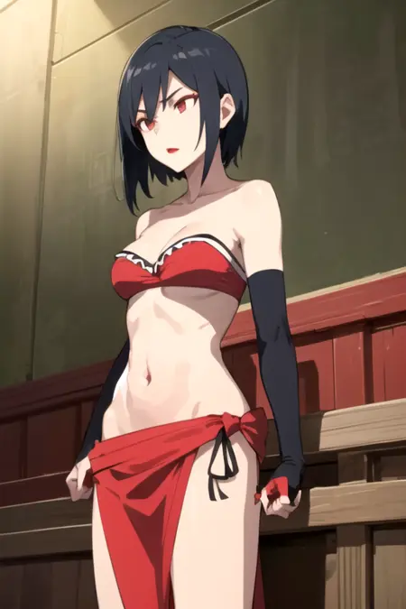 XiaoJie, 1girl, solo, short hair, black hair, red eyes, navel, cleavage, bare shoulders, medium breasts, red bikini, midriff, groin, strapless, elbow gloves, bridal gauntlets, bikini top only, red sarong, red lips