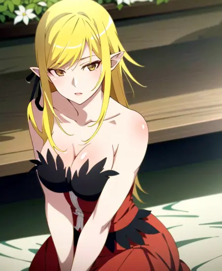 触发词并非必需,但建议添加她红色连衣裙等标签,例如(金发、尖耳朵、红色连衣裙、黑色丝带)(kiss-shot acerola-orion heart-under-blade)