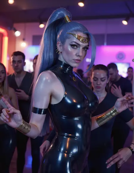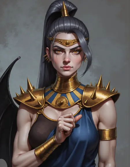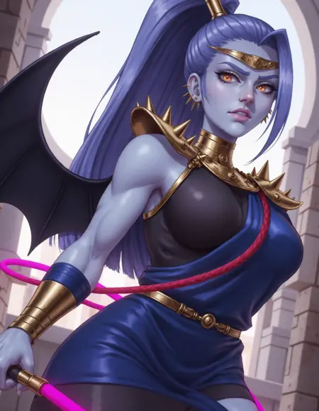 트리거 단어는 '메게라. 그녀는 옅은 파란 피부와 날카로운 노란 눈을 가지고 있으며, 날카로운 단일 날개를 지녔다. 그녀의 머리는 같은 파란색으로 된 인상적인 높은 토끼꼬리 모양의 머리카락이며, 등뒤로 흘러내린다.' 또는 그녀의 일반적인 특징을 충분히 포함하는 내용.