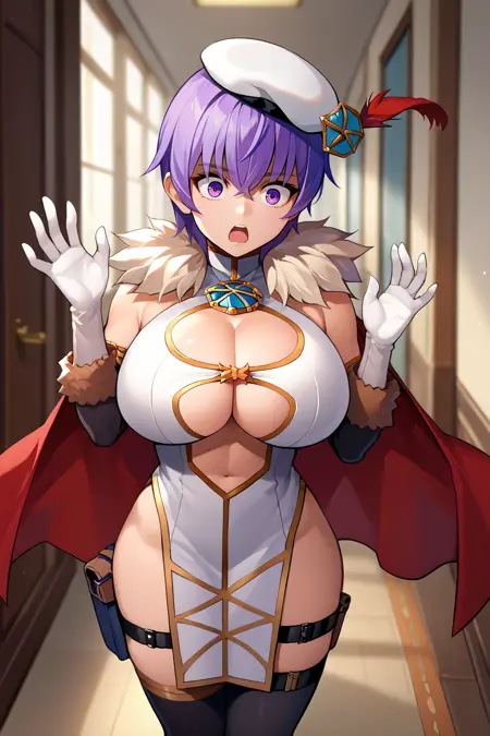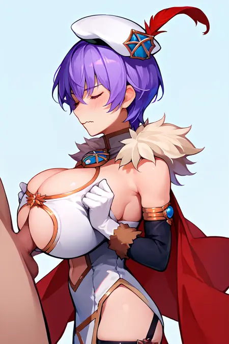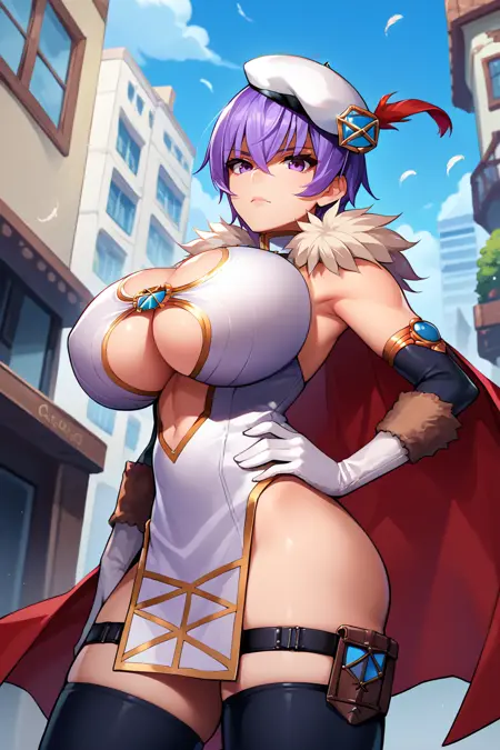 그녀의 전형적인 외모를 표현하려면 "귀걸이, 흰색 베레모, 깃털, 모피 테두리, 흰 드레스, 빨간 망토, 가슴 절개, 팔꿈치 장갑, 허벅지 스트랩, 검은 허벅지양말"을 추가하세요.