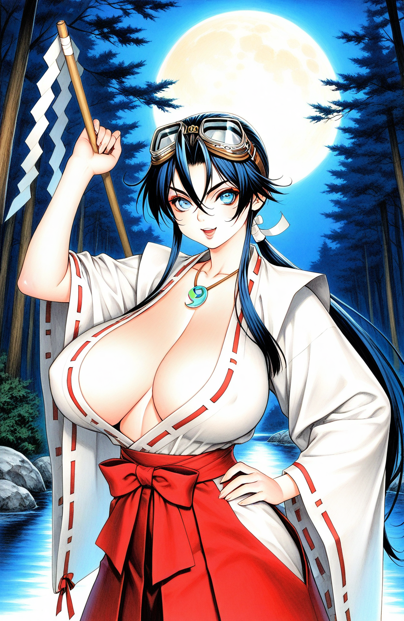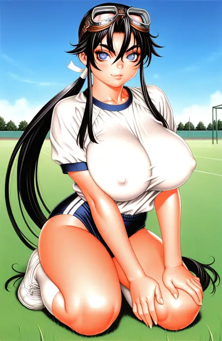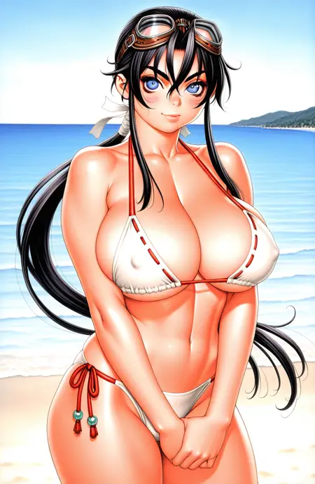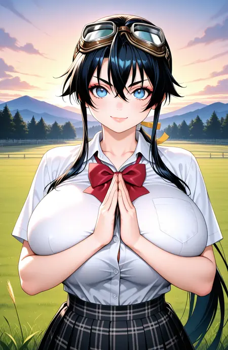Togashi_Koyori, 1girl, solo, very long hair, black hair, goggles on head, blue eyes, lips, low ponytail, huge breasts, sidelocks, hair between eyes,