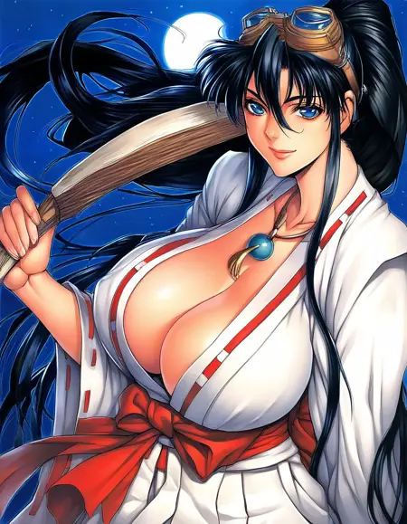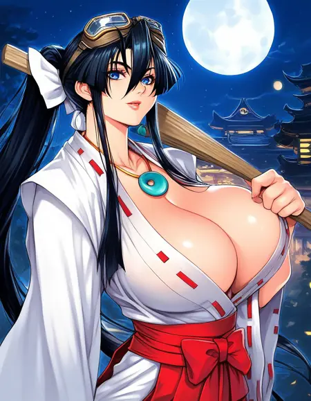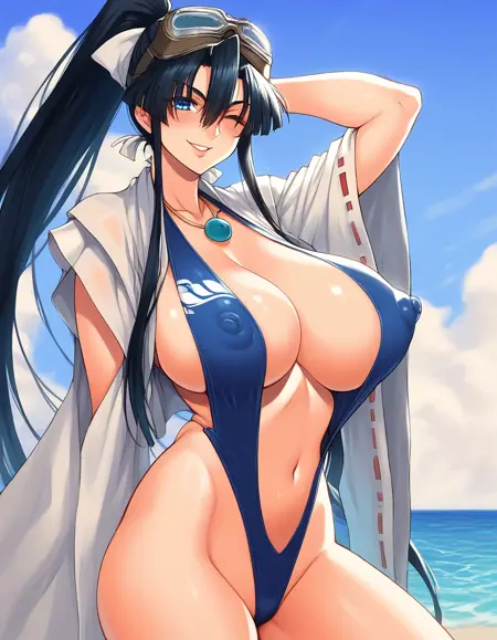 Togashi_Koyori, 1girl, solo, very long hair, black hair, goggles on head, blue eyes, lips,low ponytail, huge breasts, sidelocks, hair between eyes,