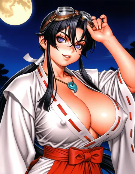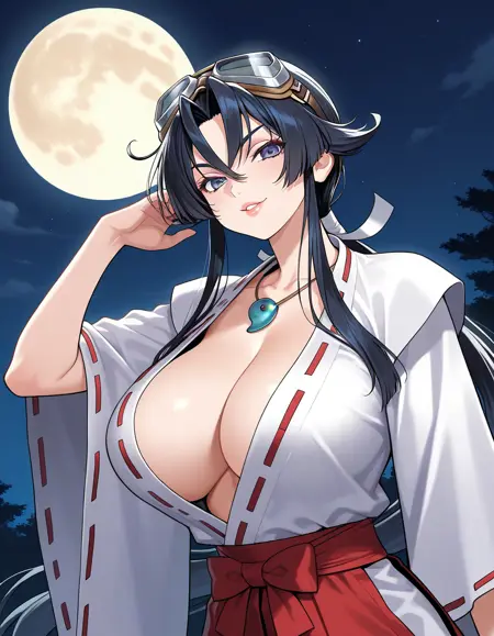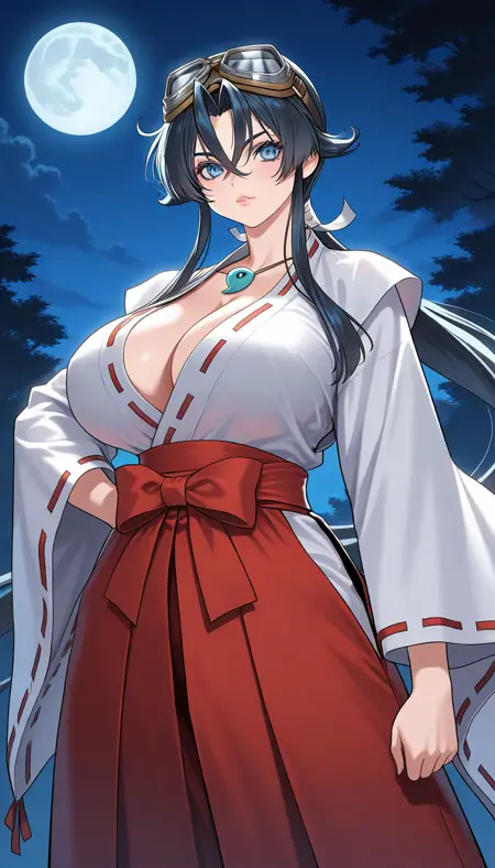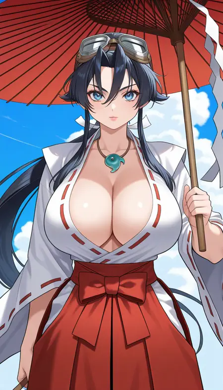 Togashi_Koyori, 1girl, solo, very long hair, black hair, goggles on head, blue eyes, lips,low ponytail, huge breasts, sidelocks, hair between eyes,