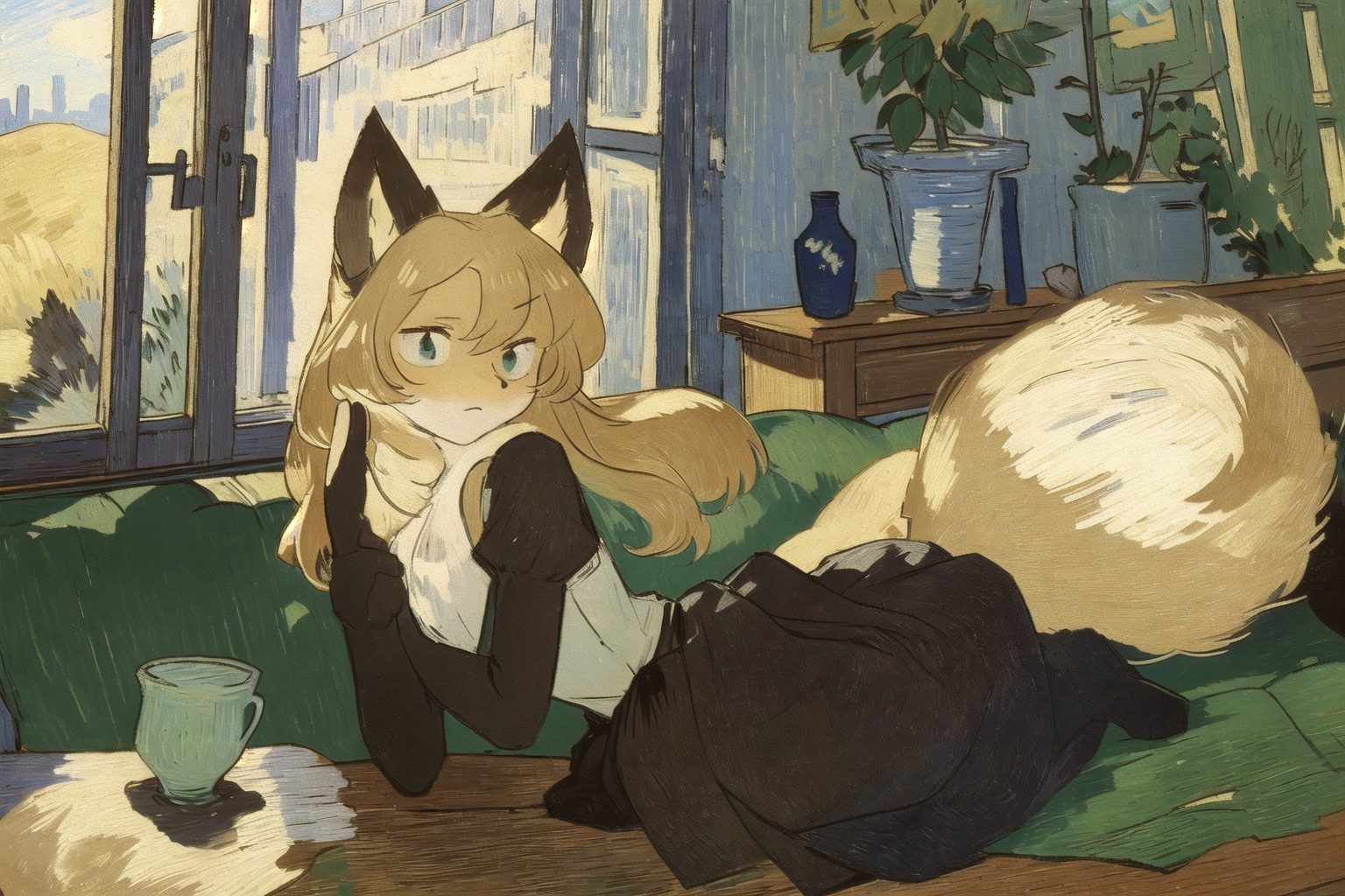 cartoonIf you're aiming for a more flat / simple style. Or, if you want more detail and shading, try putting in negative.winkingOne sided wink, like o.<genki eyes/closed eyes/genki closed eyesGenki eyes, like >.<. Closed eyes, like -.-. Genki closed eyes can also work.green sweaterFor the green sweater featured in a lot of her drawings.chicken sandwichTurns out most models don't know how to make a chicken sandwich (it'll just be a burger or a sliced bread sandwich). Sort of overfitted, they'll be huge a lot, you'll need to prompt around that.big smileOpen mouthed smile.prone/down lownSort of going low, like they're sneaking.ears droopingPuts her ears down / lower. Luck heavily involved.v/peacePeace hands.
