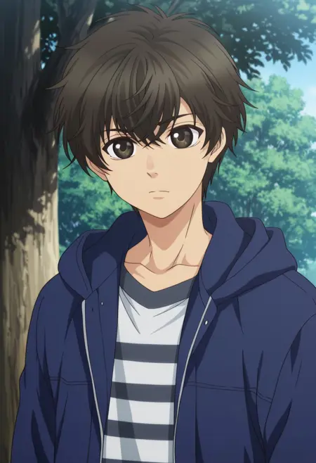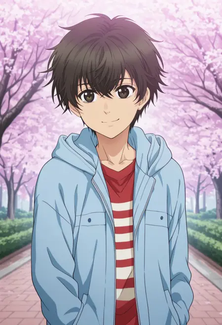 1boy, male focus, solo, brown eyes, brown hair, striped shirt, blue jacket, hood, open jacket, red shirt, pants,