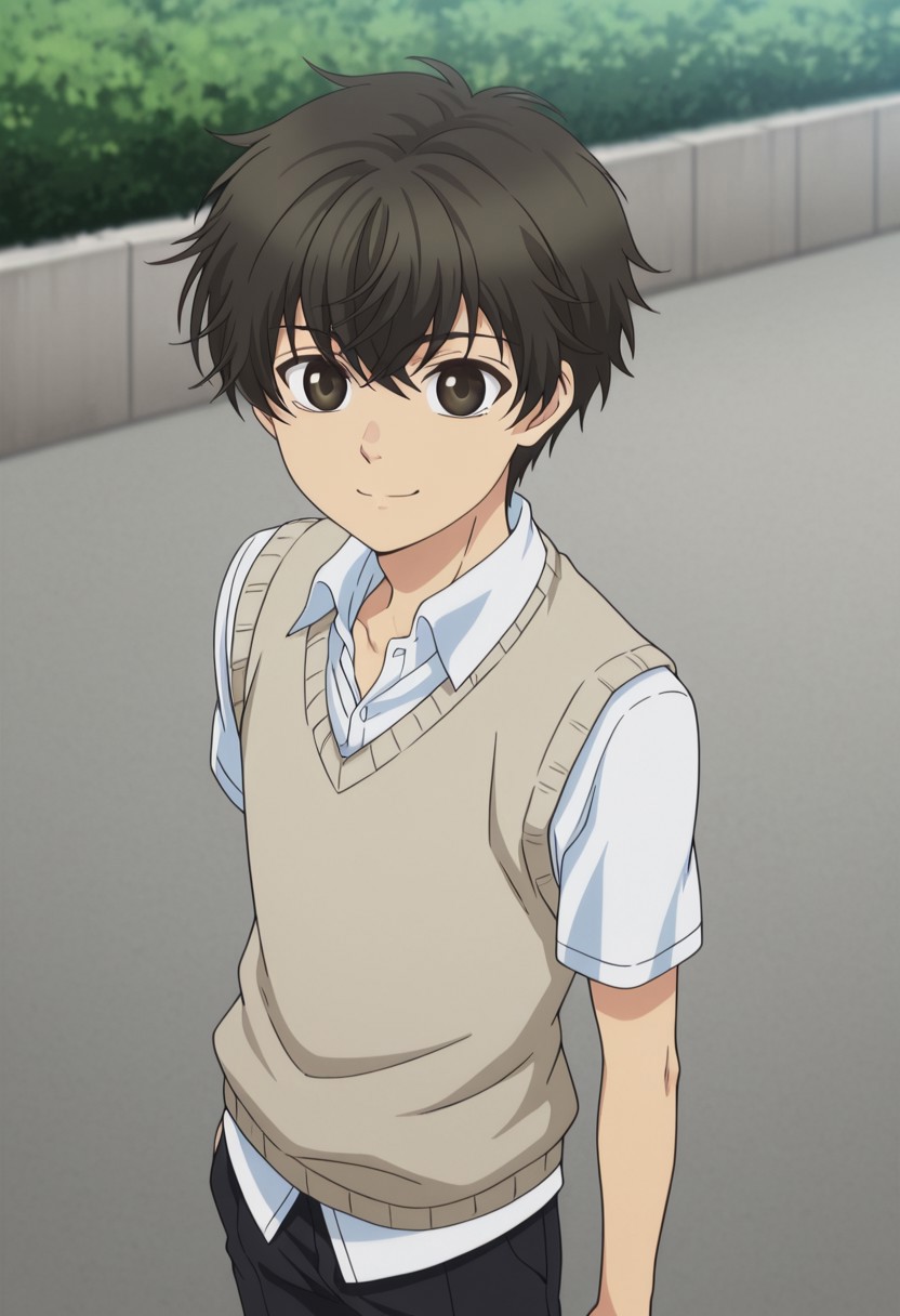 rekaido, 1boy, male focus, sweater vest, brown hair, shirt, school uniform, brown eyes, collared shirt, white shirt, pants