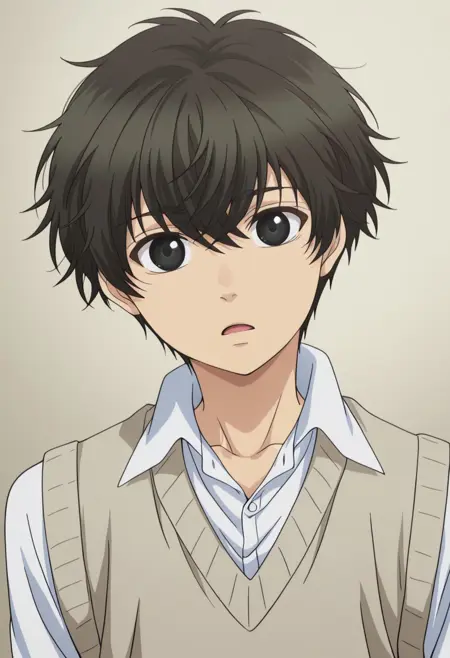 1boy, male focus, solo, brown eyes, brown hair, white shirt, collared shirt, sweater vest, black pants,