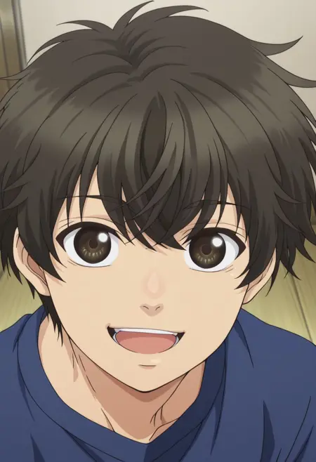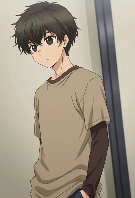 1boy, male focus, solo, brown eyes, brown hair, short over long sleeves, brown shirt, denim, sneakers, red footwear,
