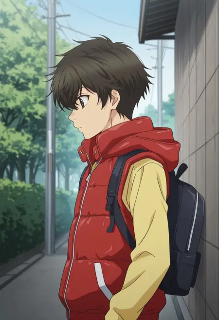 1boy, male focus, solo, brown eyes, brown hair, yellow shirt, long sleeves, red jacket, sleeveless jacket, pants,