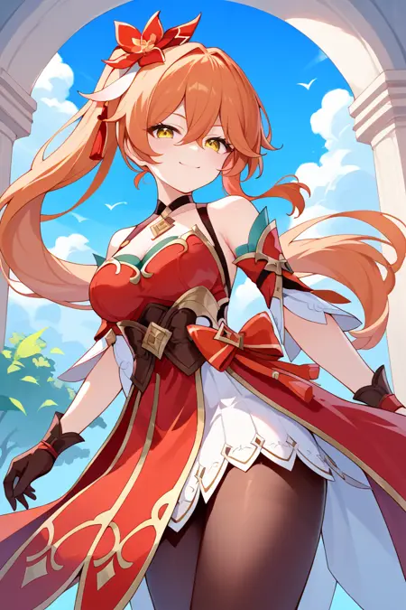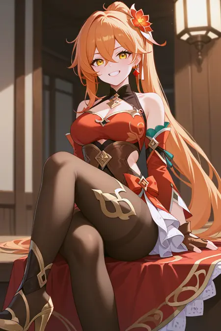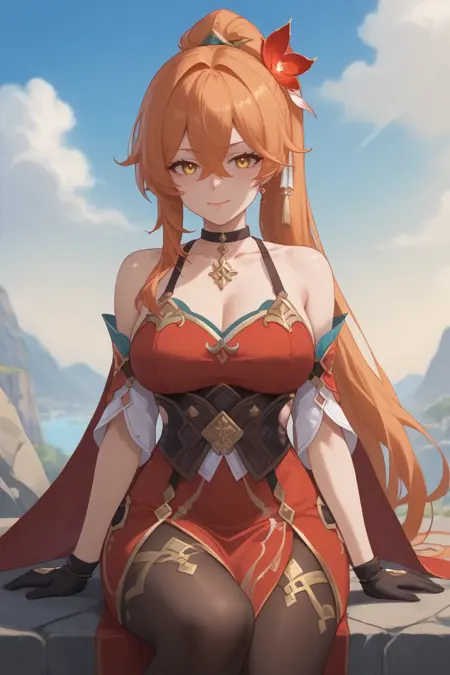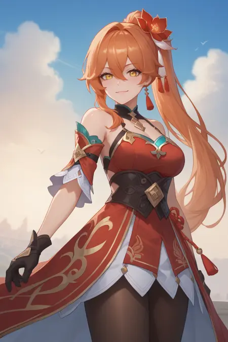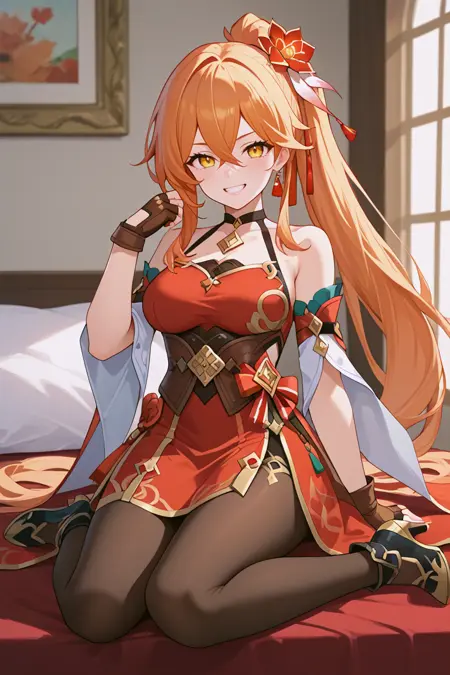 빨간 드레스, 장갑, 팬티스타킹, 파이 타일, 헤어 플라워, 부츠, 귀걸이, 갈색 장갑, 검은 팬티스타킹, 보석, 긴 소매, 어깨가 드러난 드레스, 하이힐, 미소, 손가락 없는 장갑