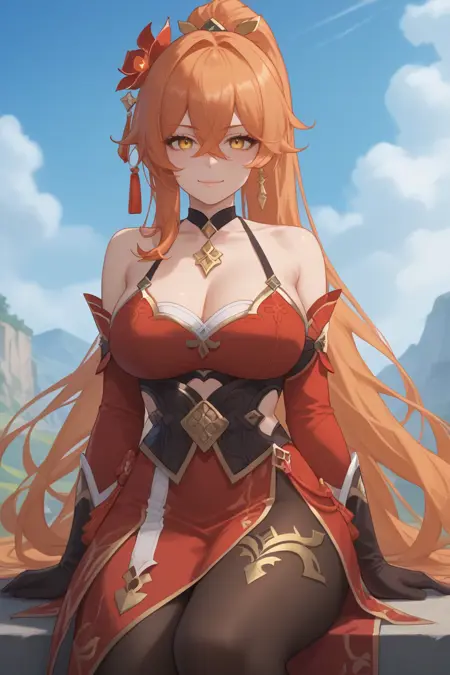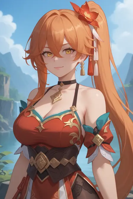 GuinaifenBren, 1girl, solo, long hair, yellow eyes, hair between eyes, ponytail, orange hair, blush, medium breasts, blonde hair