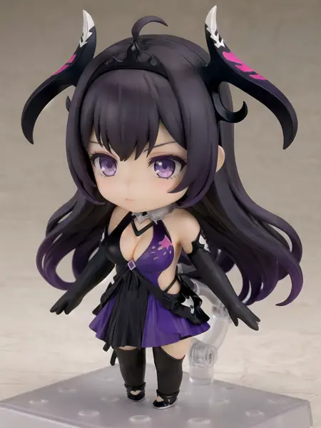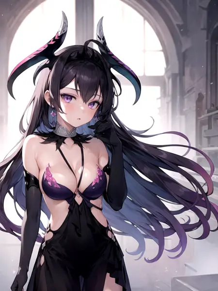 dsstene, 紫色眼睛, 黑发, 紫发, 长发, 刘海, 中等胸部, 天灵发, 头冠, 角, 连衣裙, 袖套, 乳沟, 赤肩, 服装镂空