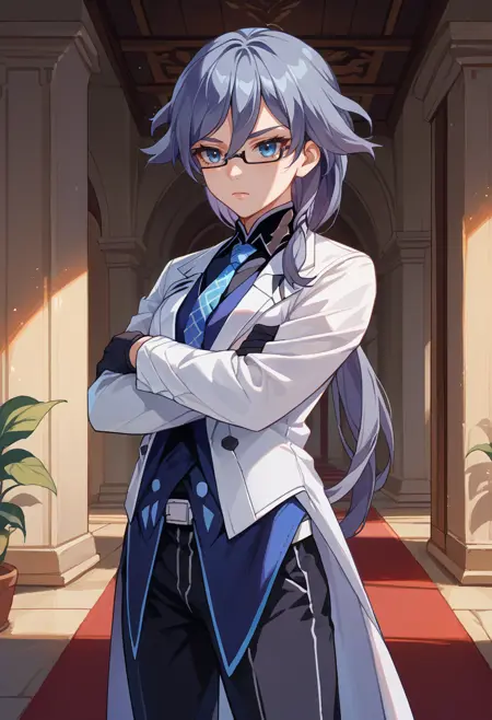 HuaNightSquire, 蓝眼睛, 灰色头发, 长发, 低马尾, 眼镜, 白色夹克, 蓝色背心, 蓝色领结, 黑色手套, 白色腰带, 黑色长裤