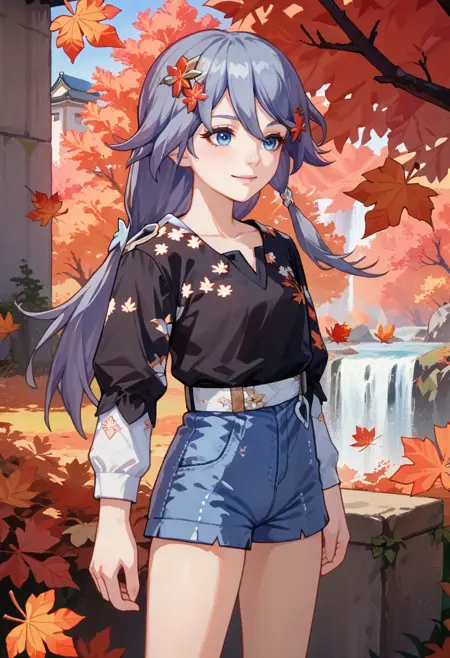 HuaAutumn, 蓝眼睛, 灰色头发, 长发, 马尾, 发饰, 黑色衬衫, 树叶印花, 袖子长过肘部, 白色腰带, 牛仔短裤, 高腰短裤