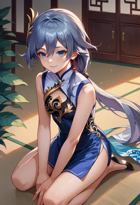 HuaSwallow, 蓝眼睛, 灰色头发, 长发, 低马尾, 发饰, 流苏耳环, 露胸剪裁, 旗袍, 蓝色连衣裙, 无袖, 短裙