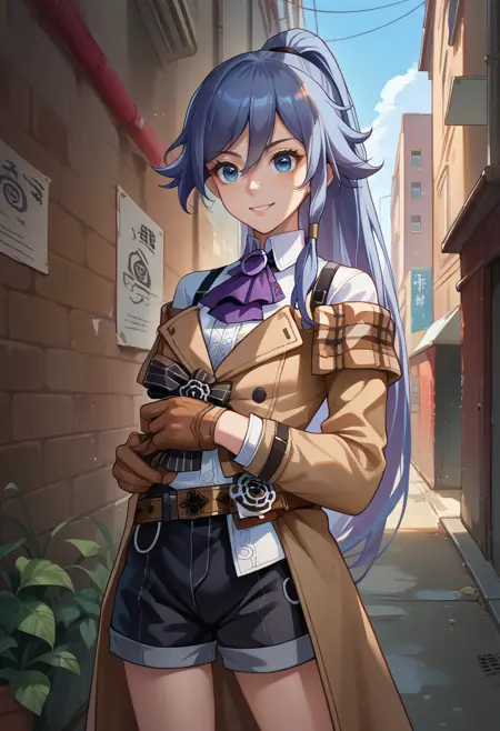 HuaHotF, 蓝眼睛, 蓝色头发, 长发, 高马尾, 单片眼镜, 侦探, 棕色外套, 白色衬衫, 紫色领结, 棕色手套, 棕色腰带, 黑色短裤