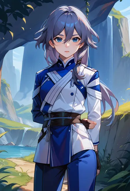 HuaTaixuan, 蓝眼睛, 灰色头发, 低扎长发, 双色制服, 白色制服, 蓝色制服, 长袖, 无指手套, 蓝色长裤