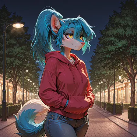 Audr3yC4t、青い毛並み、青いポニーテール、長い髪、黄色い目、吻