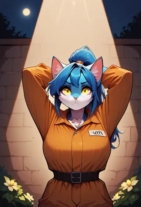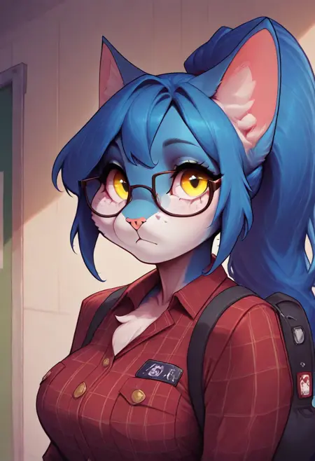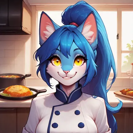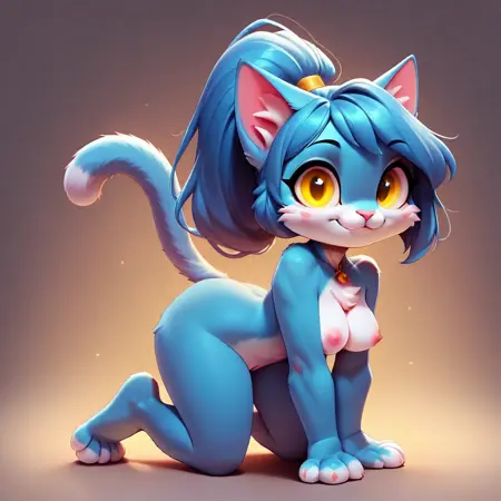 Creates an anthro cat with blue fur, yellow eyes and a blue ponytail.