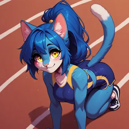 Audr3yC4t,蓝色毛发,蓝色马尾,黄色眼睛,大胸部