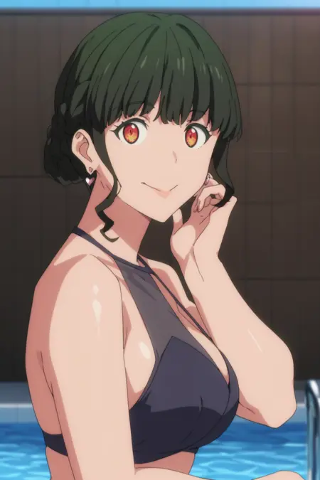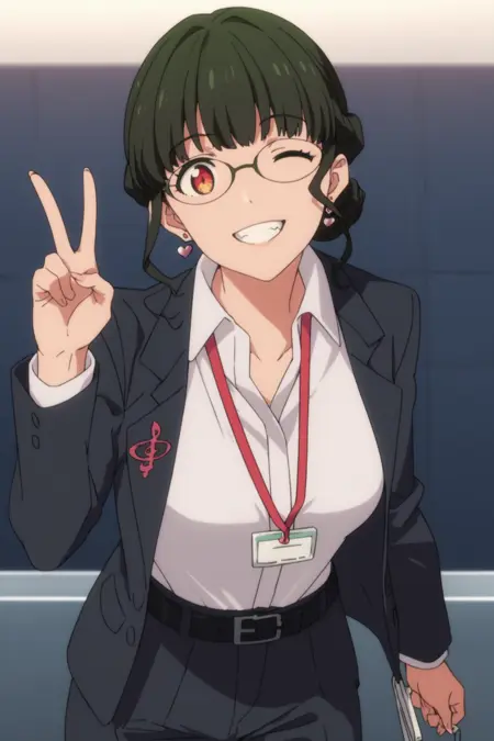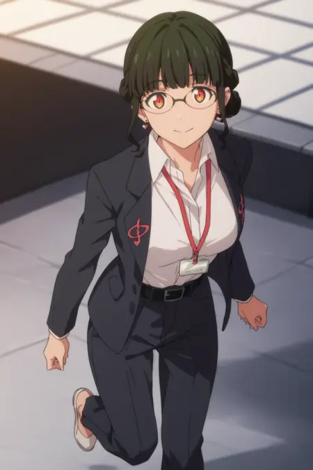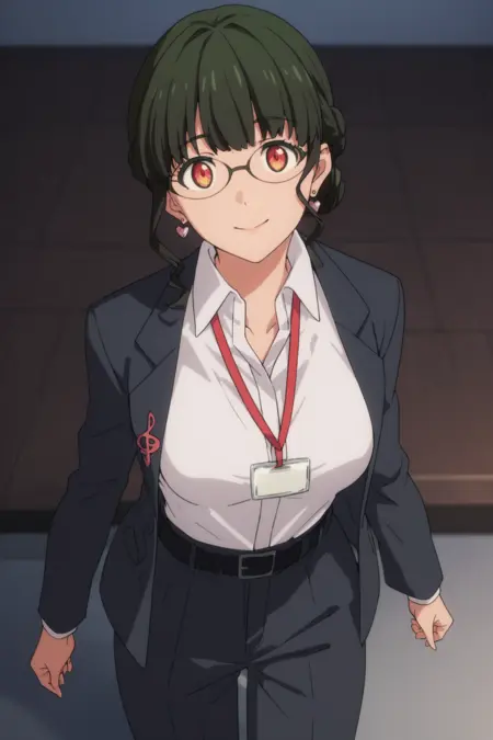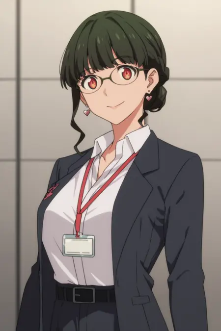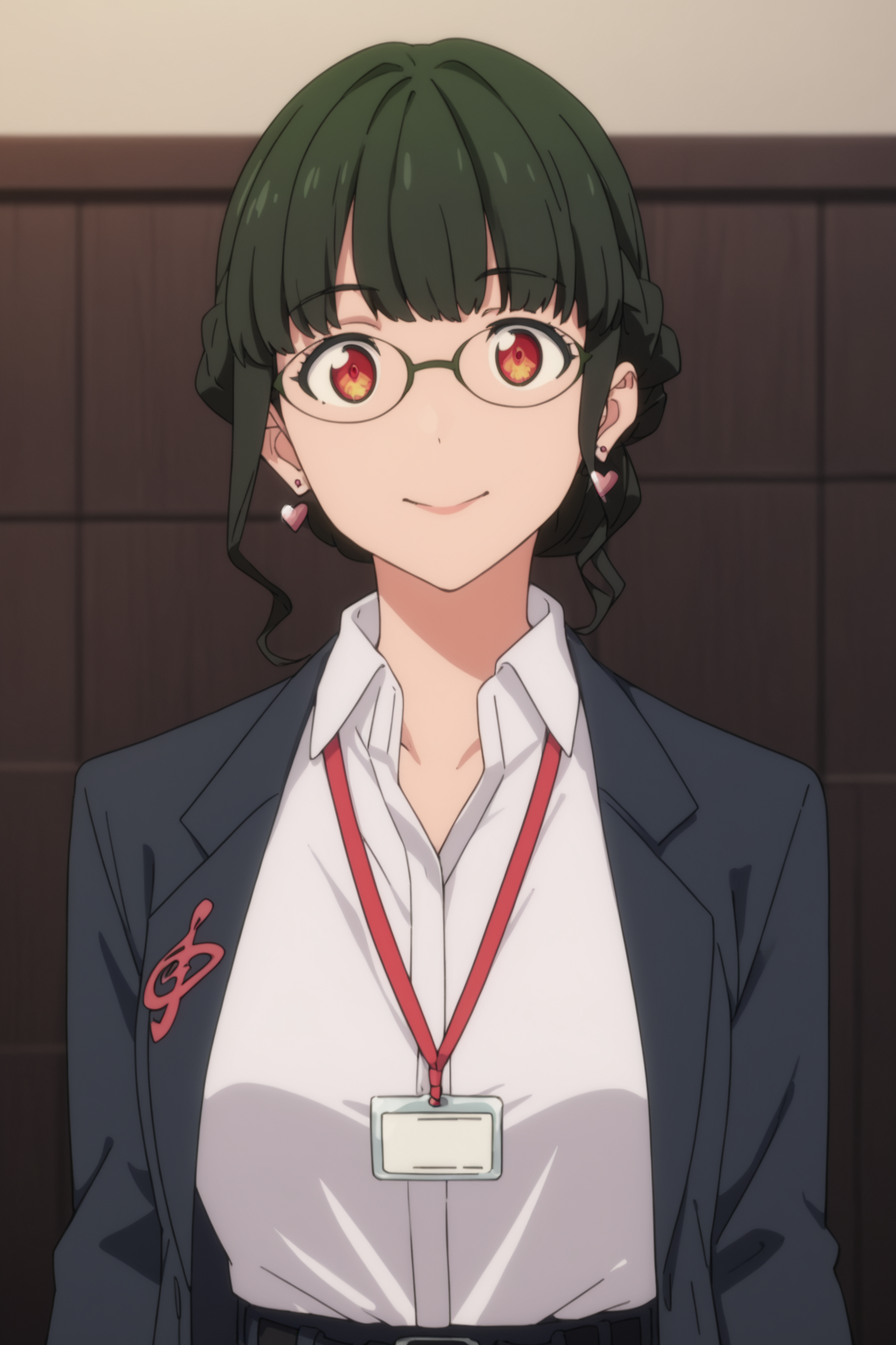 anosillus the 2nd、濃い緑色の髪、短髪、低く結んだ髪、フランス編み、赤い目、眼鏡、ハート型のイヤリング、スーツ、グレーのジャケット、白いシャツ、衿付きシャツ、ランヤード、開いたジャケット、黒いベルト、グレーのパンツ
