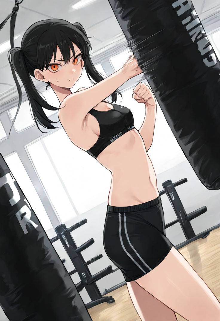 black hair, medium hair, twin side ponytail, orange eyes