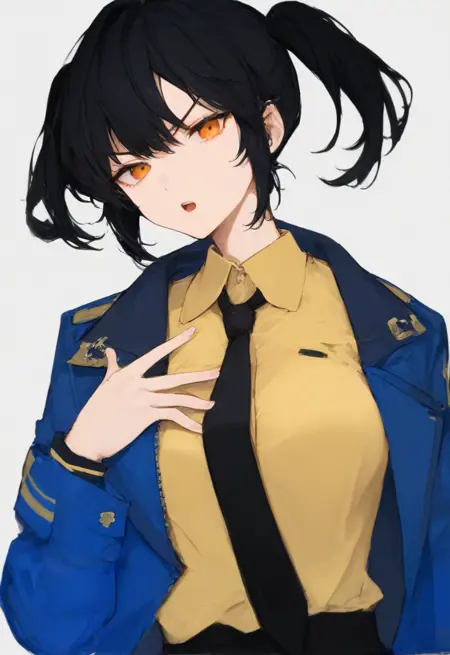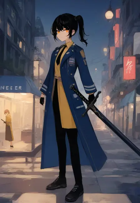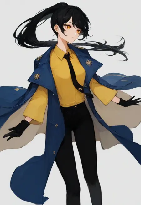 yellow shirt, black necktie, black pants, black footwear, blue coat, open coat