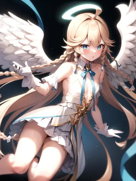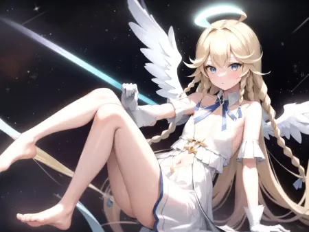 dsaola, blue eyes, blonde hair, very long hair, twin braids, bangs, ahoge, halo, angel, flat chest, white dress, navel cutout, gloves, detached collar, strapless, neck ribbon, blue ribbon, bare shoulders, angel wings, barefoot