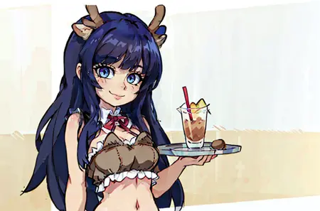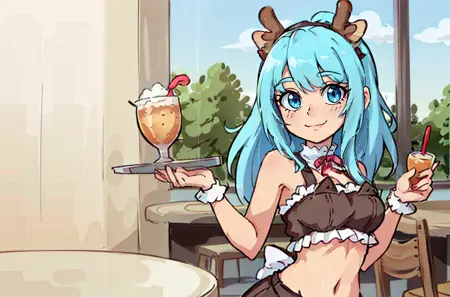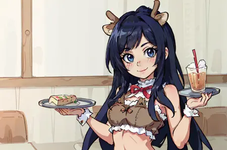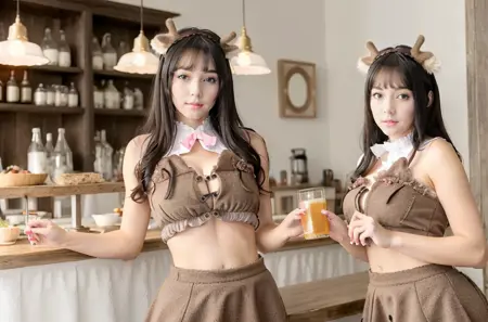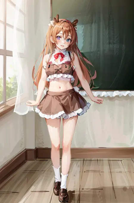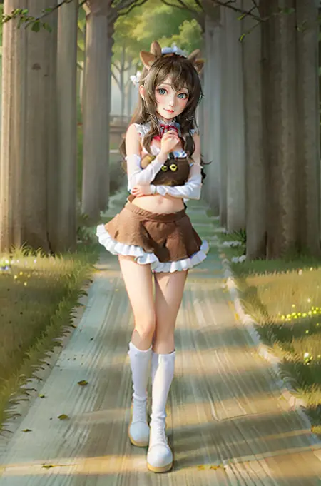 棕色上衣,棕色裙子,鹿角,露脐装,裸露肩膀,裸露手臂