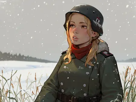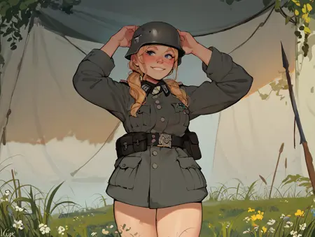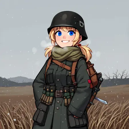 穿灰绿色制服的士兵标签:灰色制服,灰色军装,灰色头盔,弹药袋,背包,((背包可选但推荐))