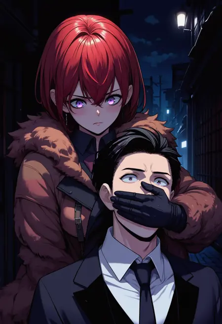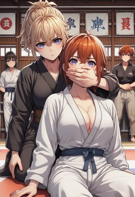 要描述捂住嘴巴的人,在标签后添加 "dom"。示例:"红发 dom"、"蓝眼睛 dom"、"红色夹克 dom" 等。