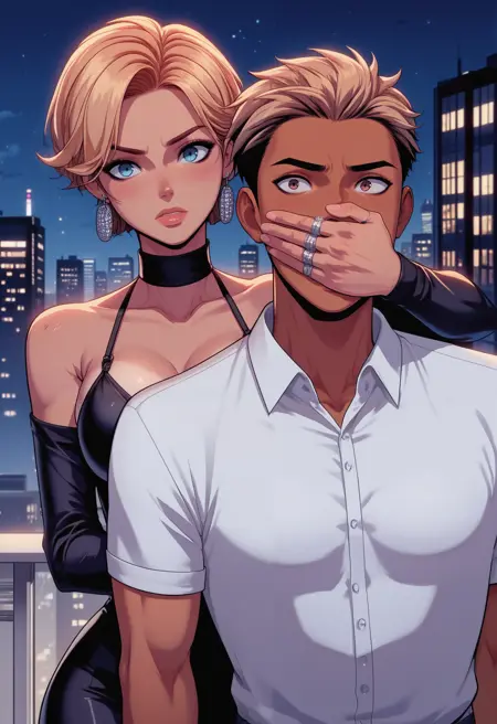 要描述捂住嘴巴的人,在标签后添加 "dom"。示例:"红发 handgagger, 蓝眼睛 handgagger, 红色夹克 dom" 等。