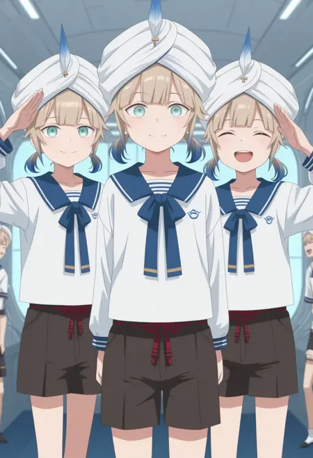 海军:渐变发色,金色头发,蓝色头发,蓝色眼睛,中性风,1男孩,短发,低双马尾,头巾,水手服,短裤