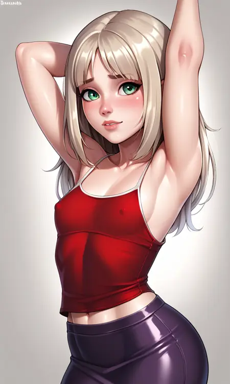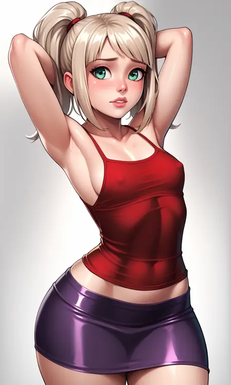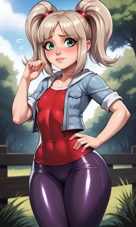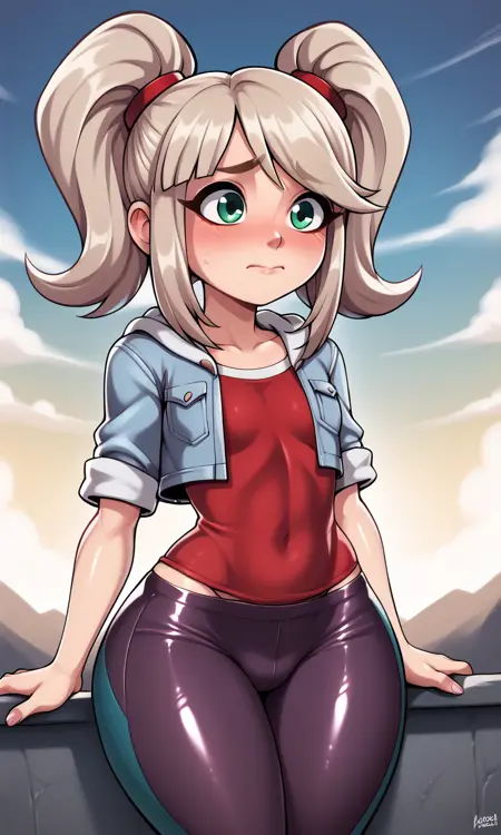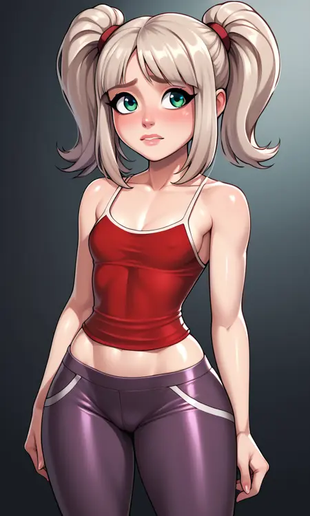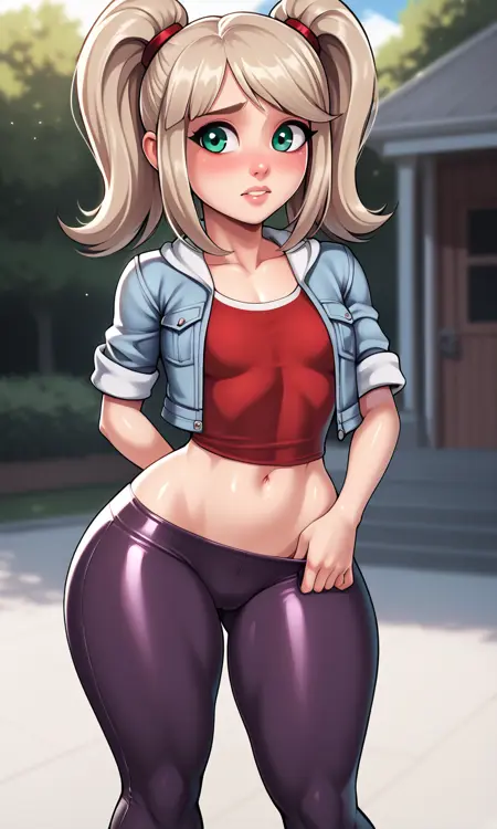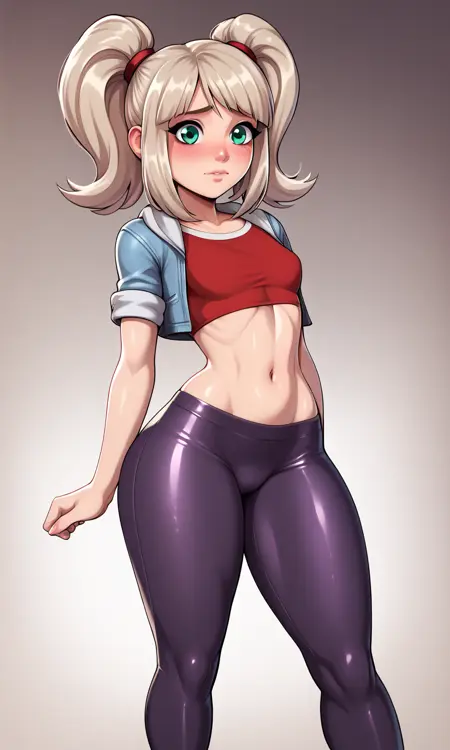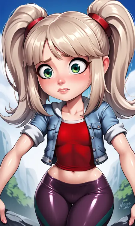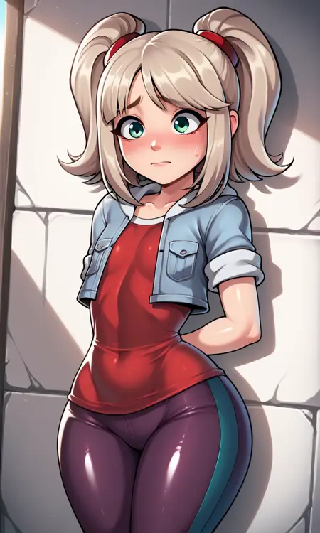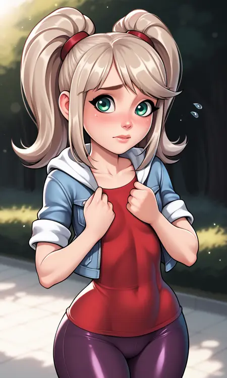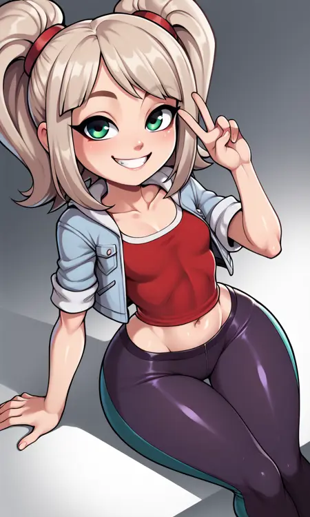 EmmaCole, 1girl, twintails, sidelocks, blonde hair, platinum hair, green eyes, light blue jacket, short sleeves, red shirt, dark purple pants, two-tone pants, red sneakers
