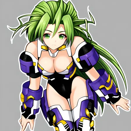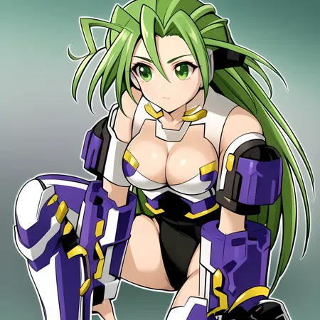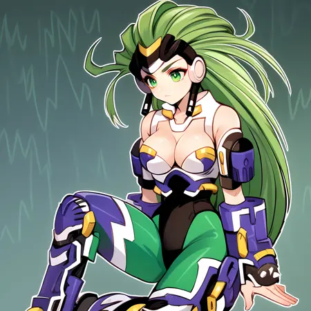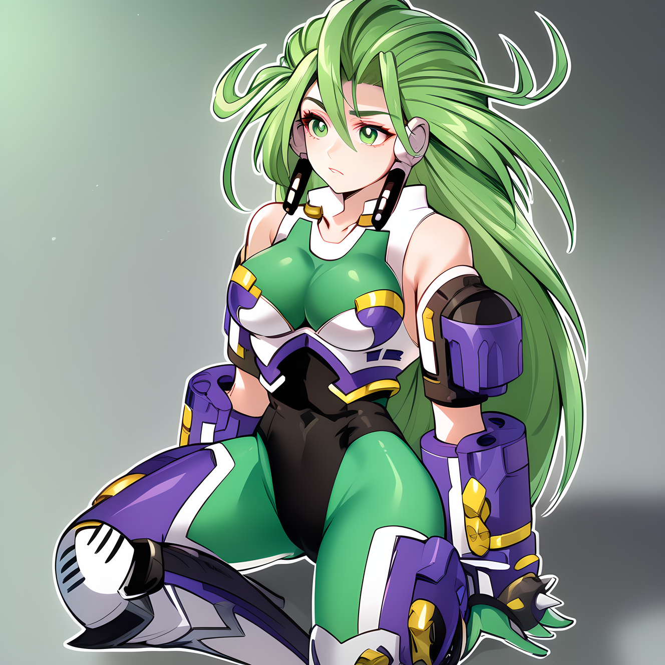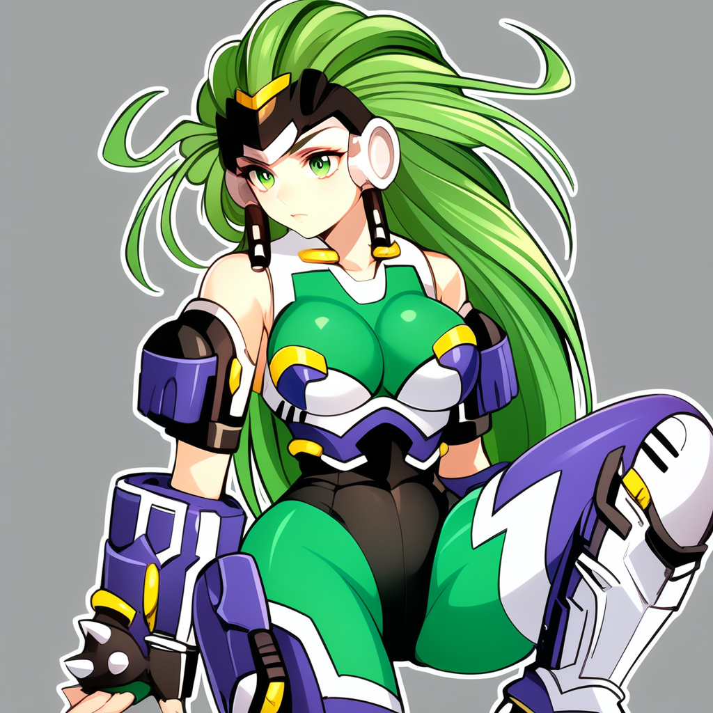 android, green eyes, green hair, long hair, medium breast,