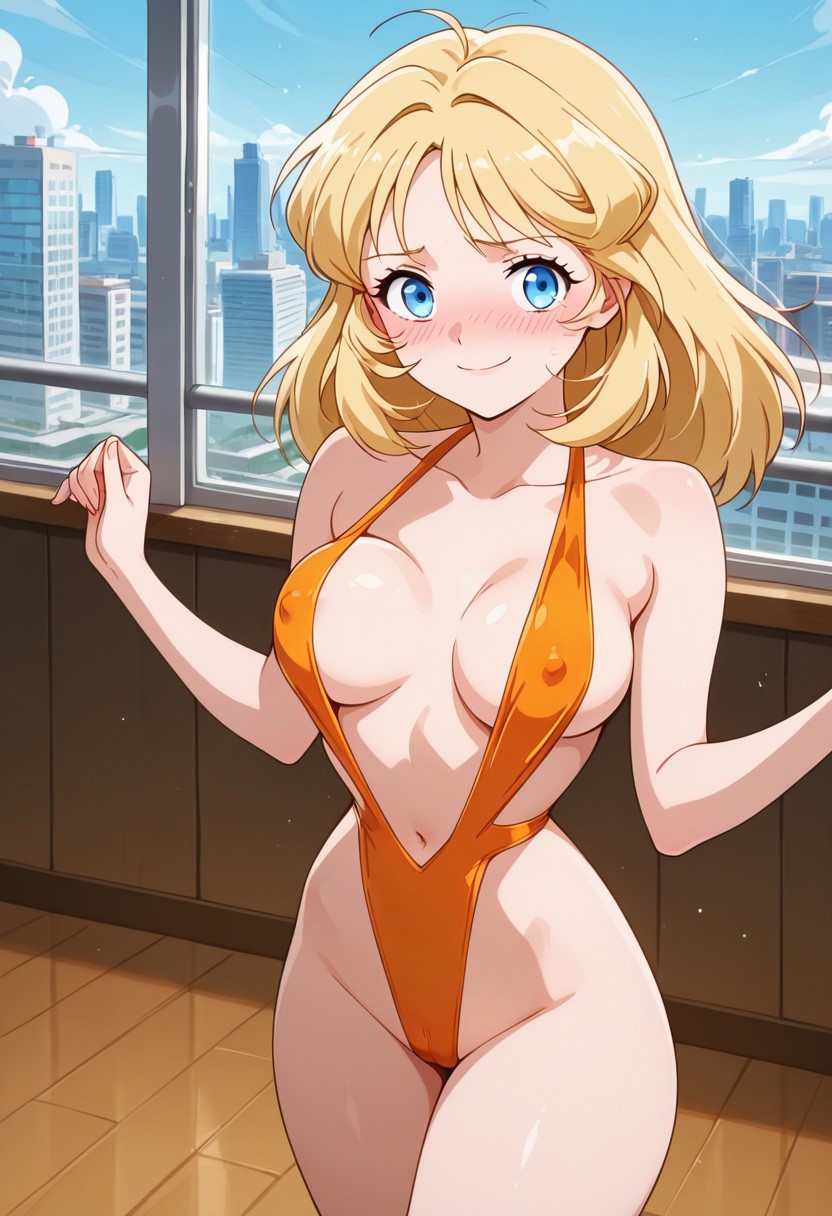 Orange dance outfit: (Orange slingshot monokini, mirco monokini, bare neck,), (white flat shoes),